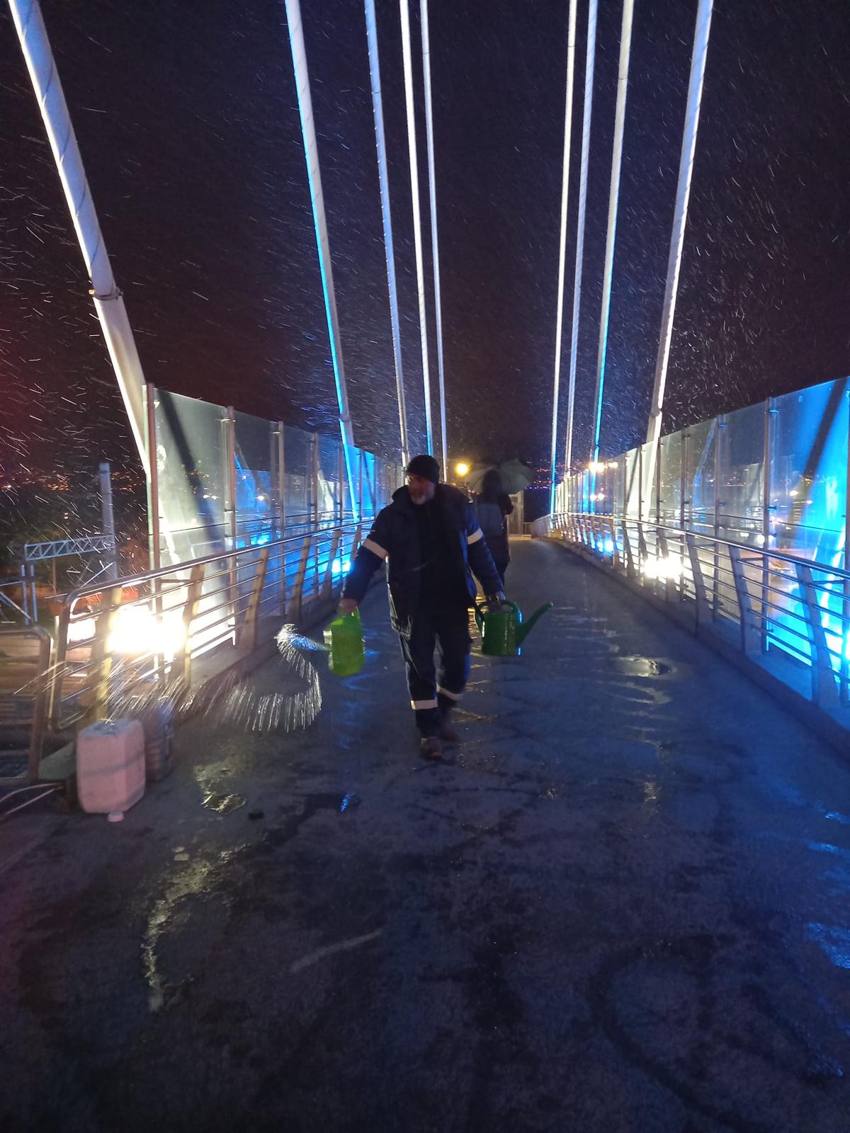 İlimizde etkisini gösteren soğuk ve yağışlı havayla birlikte Kocaeli Büyükşehir Belediyesi ekipleri, vatandaşların herhangi bir olumsuzluk yaşamaması için çalışmalarını sürdürüyor. Bu kapsamda Park ve Bahçeler Dairesi Başkanlığı ekipleri, soğuk havayla birlikte oluşan buzlanmalara karşı yaya üst geçitlerinde solüsyon çalışması yapıyor. Park ve Bahçeler Dairesi Başkanlığı ekipleri, buzlanma olmaması, vatandaşların kayarak zarar görmemesi için çalışmalarına gece geç saatlerde başlıyor. Ekipler buzlanmadan dolayı yayaların zarar görmemesi için solüsyonla temizlik çalışması yapıyor.