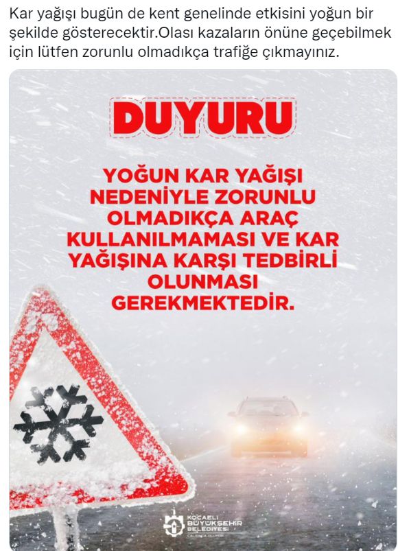 " Kar yağışı bugün de kent genelinde etkisini yoğun bir şekilde gösterecektir.Olası kazaların önüne geçebilmek için lütfen zorunlu olmadıkça trafiğe çıkmayınız."