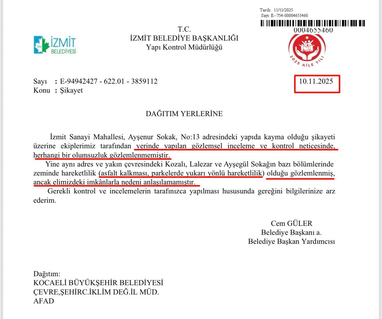 Hürriyet'in metro iddiasına İzmit'teki bir olay üzerinden belgesi ile yanıt veren Başkan Büyükakın şunları söyledi; "Oradaki binanın metrodan yıkıldığını açıklayan size, 10 Kasım 2025 tarihinde İzmit Belediyesi'nden Büyükşehir'e gelen şu yazıyı göstermek istiyorum. İzmit Sanayi Mahallesi'ndeki bir yapıda kayma olduğu şikayeti olduğu üzere herhangi bir olumsuzluk gözlemlenmediğini yazmışsınız. Belediyenizdeki imkanlar ile küçük bir kaymanın nedenini anlayamadınız da binanın metrodan kaynaklı olduğunu nasıl anladınız. Bu tespit edilemezken, metronun üzerinde yıkılan binanın tespitini hangi yetkinlikte yaptınız? Sorum bu.